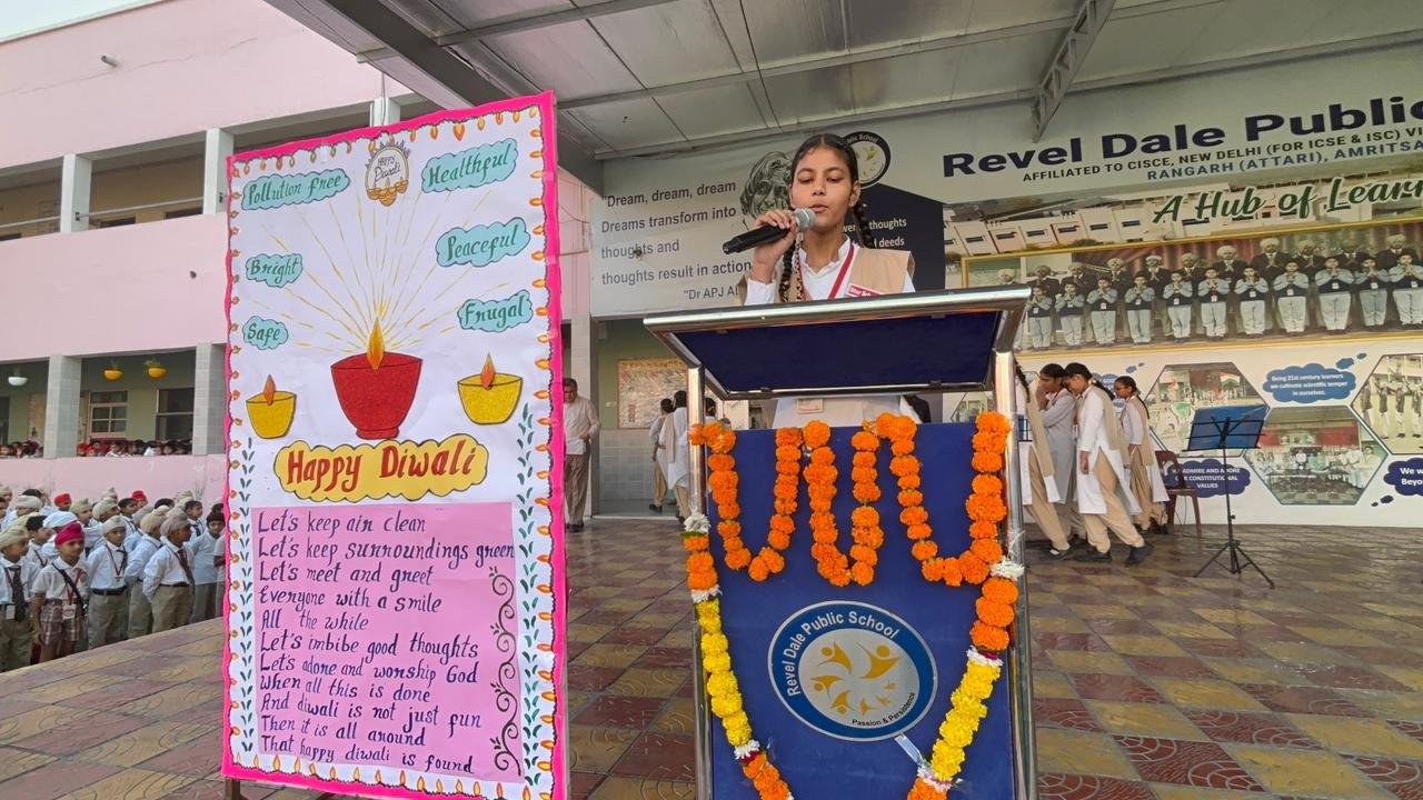 ਜਦੋਂ ਰੈਵਲ ਡੇਲ ਪਬਲਿਕ ਸਕੂਲ ਵਿਖੇ ਦੀਵਾਲੀ ਦਾ ਤਿਉਹਾਰ ਮਨਾਇਆ ਗਿਆ, ਤਾਂ ਤਿਉਹਾਰ ਦੀ ਭਾਵਨਾ ਨੂੰ ਸਭ ਤੋਂ ਅੱਗੇ ਰੱਖਿਆ ਗਿਆ। ਸਾਰੇ ਵਿਦਿਆਰਥੀਆਂ ਨੂੰ ਸਾਫ਼-ਸੁਥਰੀ, ਧੂੰਏਂ ਰਹਿਤ ਅਤੇ ਪ੍ਰਦੂਸ਼ਣ ਰਹਿਤ ਦੀਵਾਲੀ ਮਨਾਉਣ ਲਈ ਪ੍ਰੇਰਿਤ ਕੀਤਾ ਗਿਆ। ਸਾਰੇ ਵਿਦਿਆਰਥੀਆਂ ਨੇ ਪਟਾਕਿਆਂ ਤੋਂ ਦੂਰ ਰਹਿਣ ਦਾ ਸੰਕਲਪ ਲਿਆ। ਉਨ੍ਹਾਂ ਸਾਰਿਆਂ ਨੂੰ ਪਤਾ ਲੱਗ ਗਿਆ ਸੀ ਕਿ ਹਵਾ ਦੀ ਗੁਣਵੱਤਾ ਹਰ ਬੀਤਦੇ ਦਿਨ ਦੇ ਨਾਲ ਖਰਾਬ ਹੁੰਦੀ ਜਾ ਰਹੀ ਹੈ। ਵਿਦਿਆਰਥੀਆਂ ਨੇ ਹੈਰਾਨੀ ਪ੍ਰਗਟ ਕੀਤੀ ਜਦੋਂ ਉਨ੍ਹਾਂ ਨੂੰ ਪਤਾ ਲੱਗਾ ਕਿ ਉਹ ਸਾਰੇ ਗੈਸ ਚੈਂਬਰ ਵਿੱਚ ਰਹਿ ਰਹੇ ਸਨ ਕਿਉਂਕਿ ਜਾਨਲੇਵਾ ਗੈਸਾਂ ਮਨੁੱਖਾਂ, ਜਾਨਵਰਾਂ ਅਤੇ ਪੰਛੀਆਂ ਲਈ ਗੰਭੀਰ ਖ਼ਤਰਾ ਪੈਦਾ ਕਰ ਰਹੀਆਂ ਸਨ। ਵਿਦਿਆਰਥੀਆਂ ਦੁਆਰਾ ਇੱਕ ਸਕਿੱਟ ਪੇਸ਼ ਕੀਤੀ ਗਈ ਜੋ ਇਸ ਗੱਲ ‘ਤੇ ਅਧਾਰਤ ਸੀ ਕਿ ਪਟਾਕਿਆਂ ਕਾਰਨ ਵਾਤਾਵਰਣ ਵਿੱਚ ਧੂੰਏਂ ਕਾਰਨ ਜਾਨਵਰ ਅਤੇ ਪੰਛੀ ਹਮੇਸ਼ਾ ਦੀਵਾਲੀ ਤੋਂ ਕਿਵੇਂ ਡਰਦੇ ਸਨ। ਸਕੂਲ ਦੇ ਵਿਦਿਆਰਥੀਆਂ ਨੇ ਮਿੱਟੀ ਦੇ ਦੀਵੇ ਜਗਾਏ ਜੋ ਸਿੱਖਿਆ ਦੇ ਦੀਵੇ ਦਾ ਪ੍ਰਤੀਕ ਹਨ। ਵਿਦਿਆਰਥੀ ਪੂਰੀ ਤਰ੍ਹਾਂ ਸਮਝ ਗਏ ਸਨ ਕਿ ਉਨ੍ਹਾਂ ਨੂੰ ਸਾਫ਼-ਸੁਥਰੀ ਅਤੇ ਪ੍ਰਦੂਸ਼ਣ ਰਹਿਤ ਦੀਵਾਲੀ ਮਨਾ ਕੇ ਖੁਸ਼ਹਾਲ ਦੀਵਾਲੀ ਮਨਾਉਣੀ ਹੈ।