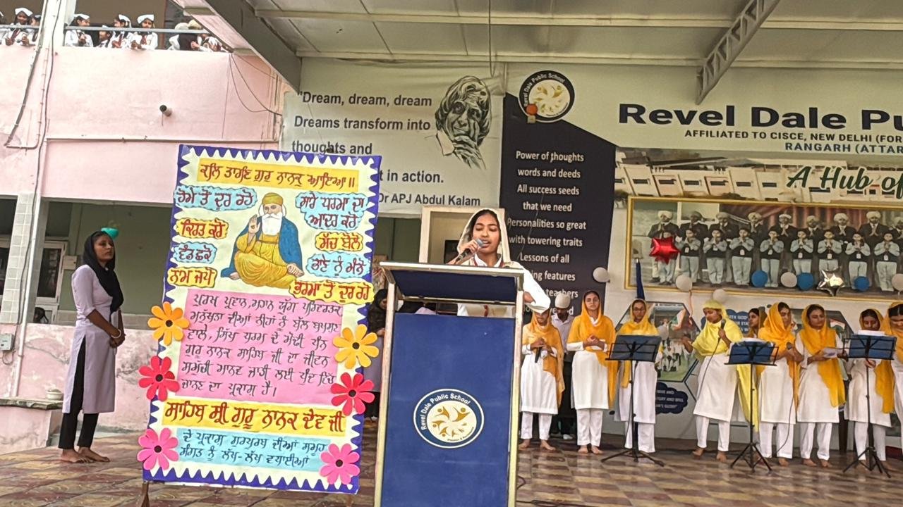 ਗੁਰੂ ਨਾਨਕ ਦੇਵ ਜੀ ਦਾ ਪ੍ਰਕਾਸ਼ ਪਰਵ ਬਹੁਤ ਹੀ ਉਤਸ਼ਾਹ ਅਤੇ ਸ਼ਰਧਾ ਨਾਲ ਮਨਾਇਆ ਗਿਆ। ਸਕੂਲ ਵਿੱਚ ਪ੍ਰਭਾਤ ਫੇਰੀ ਕੱਢੀ ਗਈ। ਵਿਦਿਆਰਥੀ ਅਤੇ ਅਧਿਆਪਕ ਪੂਰੇ ਸਕੂਲ ਵਿੱਚ ਪਵਿੱਤਰ ਗੁਰਬਾਣੀ ਦਾ ਜਾਪ ਕਰਦੇ ਹੋਏ ਪੂਰੇ ਸ਼ਰਧਾ ਨਾਲ ਚੱਲੇ। ਸਾਰੇ ਅਧਿਆਪਕਾਂ ਅਤੇ ਵਿਦਿਆਰਥੀਆਂ ਨੇ ਮੱਥਾ ਟੇਕਿਆ ਅਤੇ ਪ੍ਰਸ਼ਾਦ ਪ੍ਰਾਪਤ ਕੀਤਾ। ਗੁਰੂ ਨਾਨਕ ਦੇਵ ਜੀ ਦਾ ਪਵਿੱਤਰ ਨਾਮ ਸਕੂਲ ਦੇ ਪੂਰੇ ਮਾਹੌਲ ਵਿੱਚ ਗੂੰਜ ਉੱਠਿਆ। ਗੁਰੂ ਜੀ ਦੀਆਂ ਸਿੱਖਿਆਵਾਂ ਸਾਰੇ ਵਿਦਿਆਰਥੀਆਂ ਨਾਲ ਸਾਂਝੀਆਂ ਕੀਤੀਆਂ ਗਈਆਂ। ਸਕੂਲ ਦੇ ਸਾਰੇ ਵਿਦਿਆਰਥੀਆਂ ਨੇ ਗੁਰੂ ਨਾਨਕ ਦੇਵ ਜੀ ਦੀਆਂ ਸਿੱਖਿਆਵਾਂ ਨੂੰ ਸਤਿਕਾਰ ਨਾਲ ਸੁਣਿਆ ਅਤੇ ਸਿੱਖਿਆਵਾਂ ਨੂੰ ਆਪਣੇ ਅਸਲ ਜੀਵਨ ਆਚਰਣ ਦੁਆਰਾ ਪ੍ਰਦਰਸ਼ਿਤ ਕਰਨ ਦਾ ਸੰਕਲਪ ਲਿਆ। ਸਕੂਲ ਦਾ ਪੂਰਾ ਮਾਹੌਲ ਪਵਿੱਤਰ ਗੁਰਬਾਣੀ ਅਤੇ ਅਧਿਆਤਮਿਕਤਾ ਨਾਲ ਗੂੰਜ ਰਿਹਾ ਸੀ।